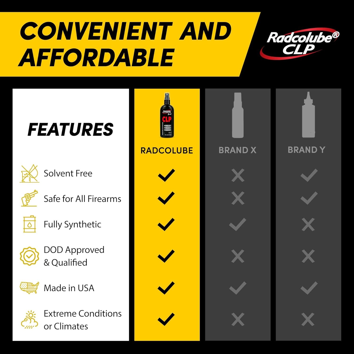 Manufactured by Radco Industries (Batavia, IL), Radcolube® CLP GUN OIL 3IN1 is the benchmark for cleaning, lubricating, and short-term preservation of small and large caliber firearm platforms.