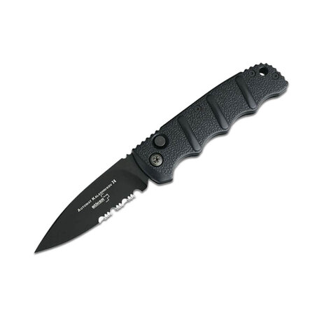 The answer to your requests for a heavy duty folding knife, the sturdy construction and pure heft of this folder allow it to hold up under even the most severe conditions. A partially serrated blade assists in cutting looped and synthetic fabrics.